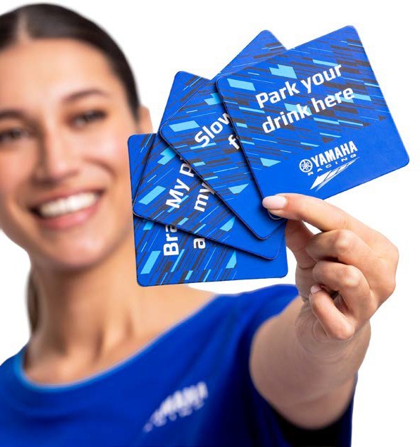 Bring some Yamaha colour to your space with the 4piece Paddock Blue Coaster Set. With Yamaha Racing branding and a fun, unique slogan on each coaster, your place just got a new talking point!